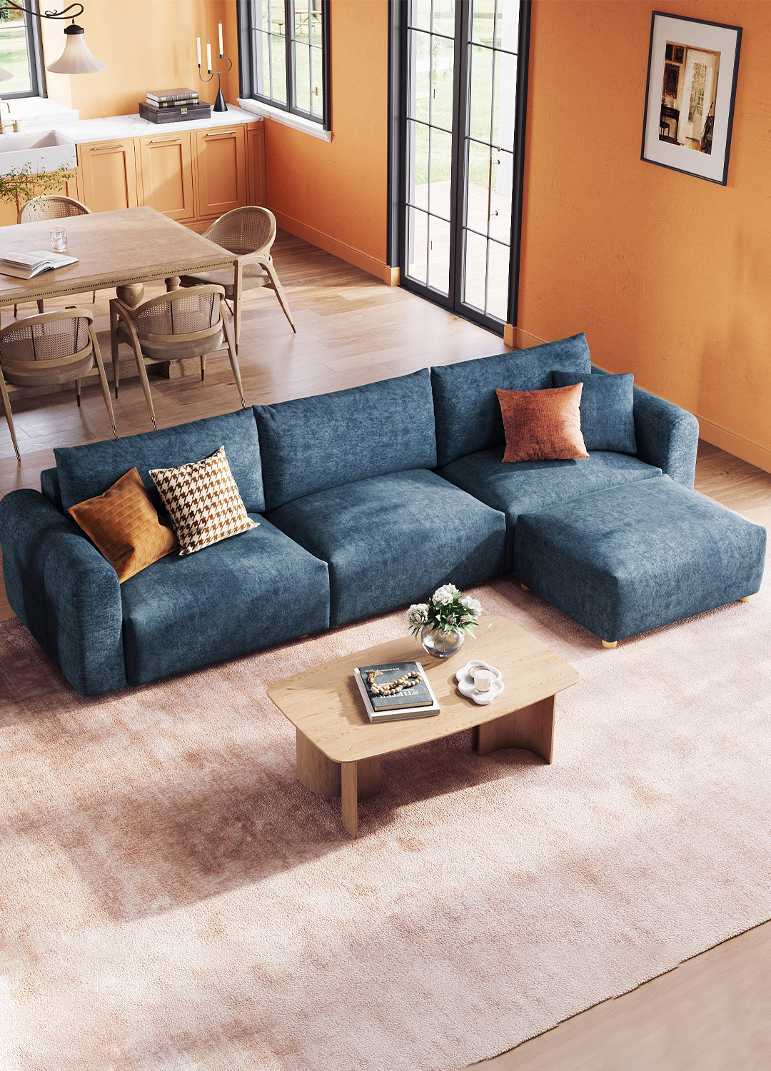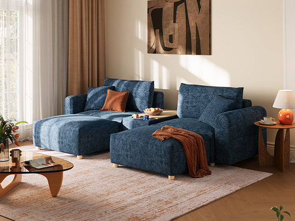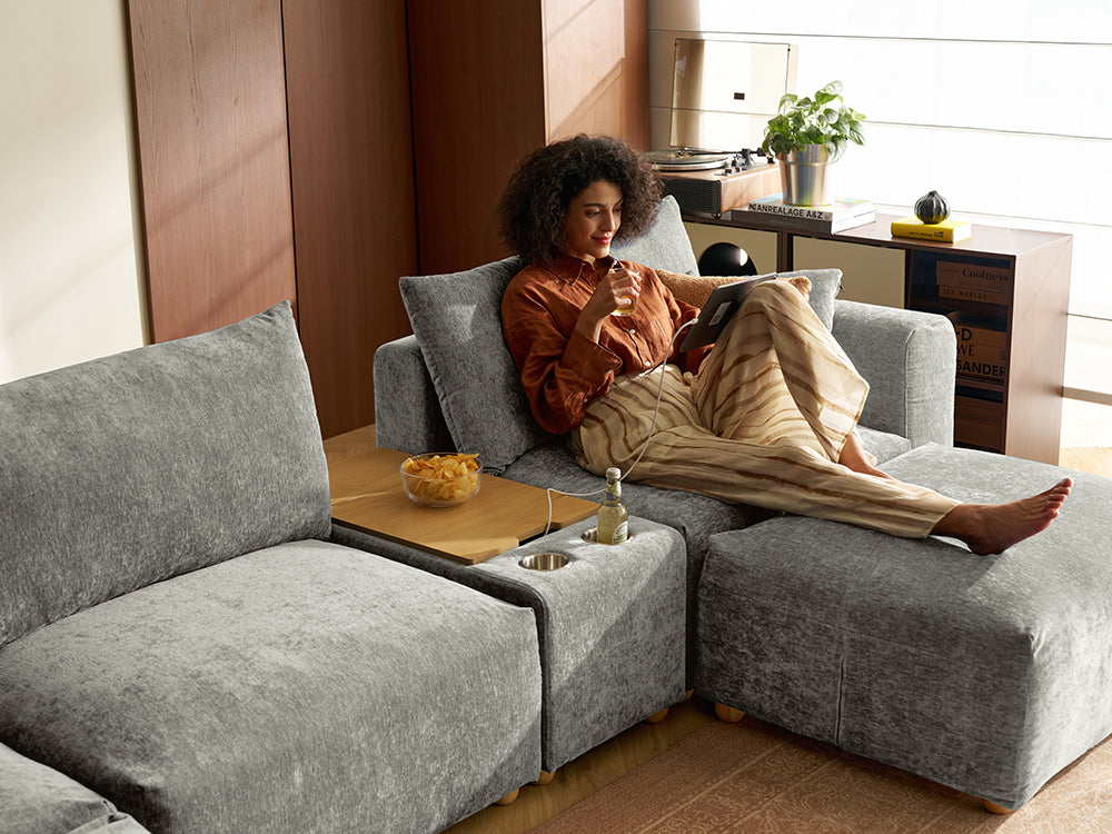 This sofa features a flexible modular design that can be arranged in multiple layouts. Its wide seats and supportive backrests provide excellent comfort, while the central armrest table and cup holders make relaxing more convenient. Perfect for reading, enjoying drinks, or socializing with friends.